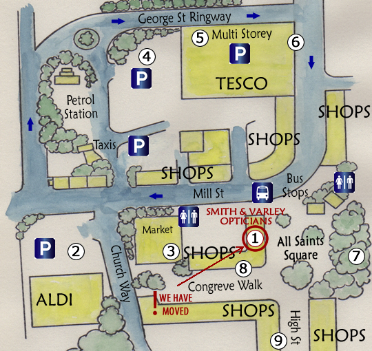 Smith & Varley Opticians is now located at 22 All Saints Square, Bedworth in the main pedestrian shopping area situated in the centre of Bedworth.